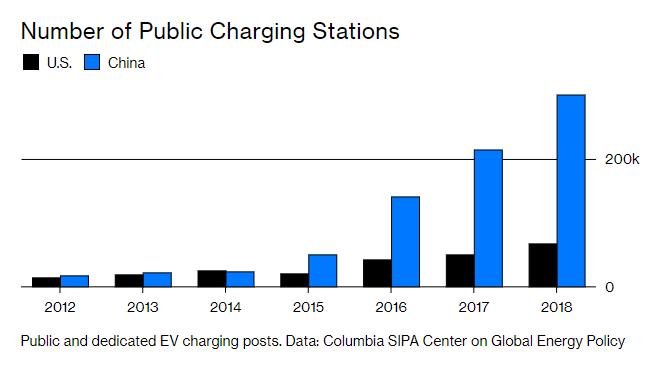 公共及专用充电站的数量(黑色:美国;蓝色:中国)