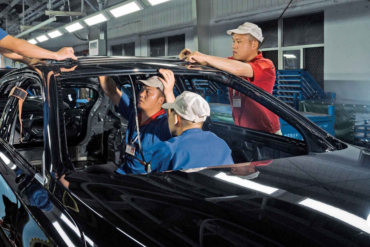 在中国南方一间巨大的工厂车间里,刚刚刷成了樱桃红或者深银色的数十辆未完工的车辆,就悬挂在一尘不染的水泥地板上方6英尺处。片刻之前它们的引擎刚刚安装完,但还只是一副骨架,与其说是实物不如说是汽车的希望。随着它们沿着生产线一路漂移下来,一个雪橇式的机器人滑行道每个底盘下方的位置,并放缓下来以匹配它的速度。