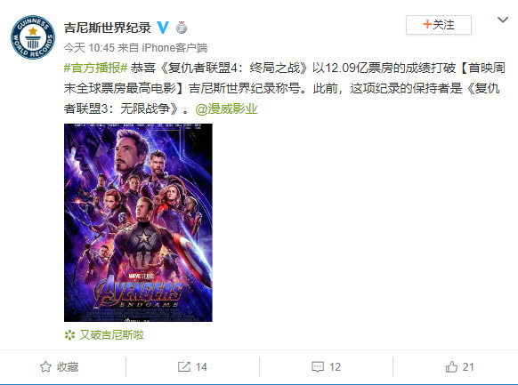 36氪讯,吉尼斯世界纪录官微宣布,《复仇者联盟4:终局之战》以12.09亿美元票房的成绩,打破“首映周末全球票房最高电影”吉尼斯世界纪录称号。这项纪录上一个保持者是《复仇者联盟3:无限战争》。