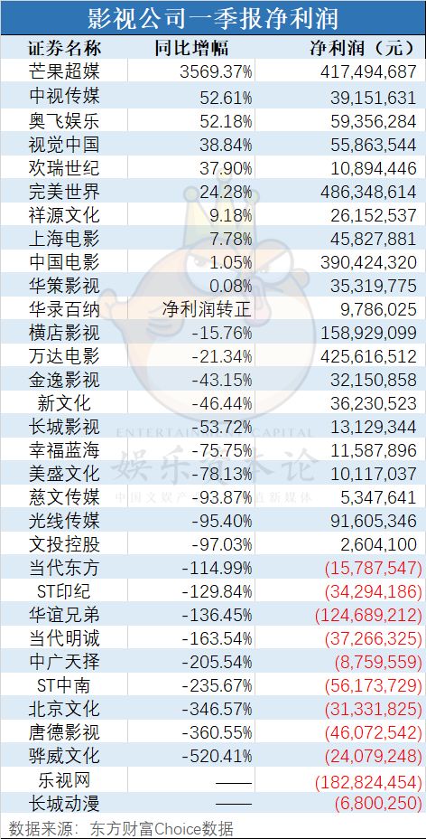 值得警惕的是,影视公司一季报成绩不算乐观,32家公司中19家净利润下滑,11家净利润亏损,包括华谊兄弟、北京文化、唐德影视、当代明诚等公司。