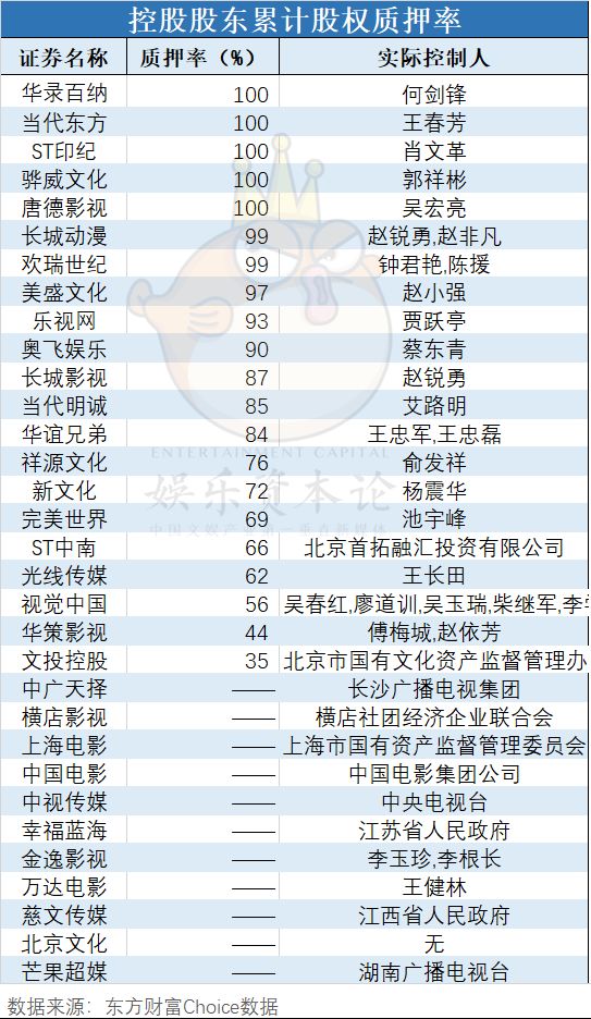 在2018年从央企改制为混合所有制的华录百纳,实控人何剑锋质押率高达100%,控制权岌岌可危。当代东方、印纪传媒、骅威文化唐德影视的实控人股权质押率也达到100%。北京文化虽无实控人,但其第一大股东华力控股质押率达100%,已经爆仓,持股已被冻结。