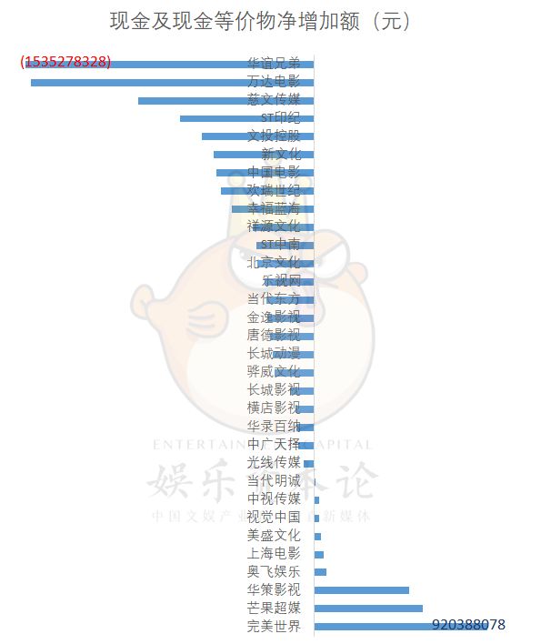 我们一看现金流——完美世界、芒果超媒、华策影视、上海电影等9家公司现金流状况良好,但大部分上市公司现金流都出现大幅下降,其中华谊兄弟、万达电影、慈文传媒现金及等价物流失幅度最大。