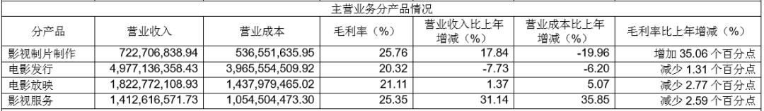 而在国内电影票房增速低于银幕增速的大环境下,营收占比最大的影院放映业务当期实现收入10.94亿元,仅上涨2.95%,毛利率下降0.20%。