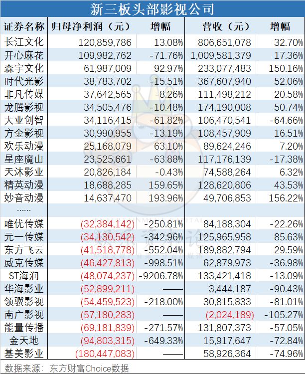 据粗略统计,一批公司逃离新三板后,剩下的影视文娱公司中,有一半公司出现亏损,7成公司净利润下降。亏损最多的是基美影业,批片起家的基美在绑定吕克·贝松后,多部影片失利,2016年到2018年,基美影业分别亏损2.65亿、5.41亿、1.8亿,三年亏掉9.8亿。海润传媒因资产减值损失及营业外支出的增加,2018年确认了坏账损失1357.96万元,审计机构出具了带有持续经营能力存在重大不确定性的无保留意见审计报告。因期末净资产为负,海润传媒被ST实行风险警示。