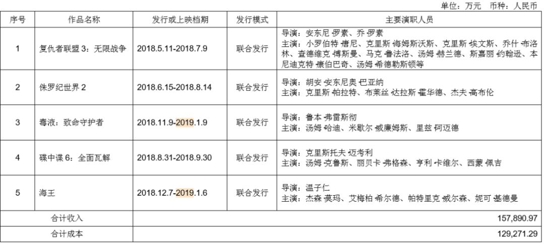 发行业务营收高达49.77亿元。其中,排名前五的发行作品共实现15.79亿元收入,扣除成本后获利2.8亿元。且均为海外引进,包括《复仇者联盟3》、《毒液》《碟中谍6》等。