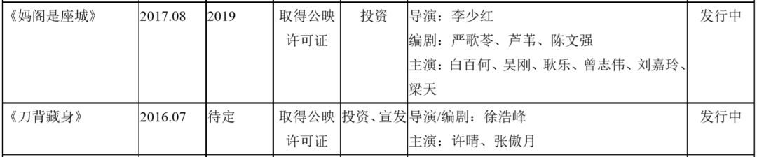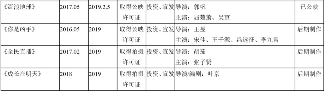 电影多达36部,包括《流浪地球》《美人鱼2》《最好的我们》等。其中《流浪地球》已经在今年3月上映并获得45亿元票房。此前公司发布公告称,预计来源于该影片的收益将高达2.7亿元-2.8亿元。