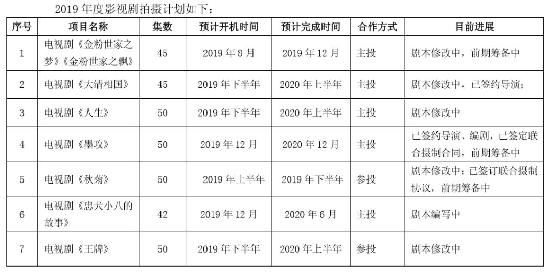 不过这一现象或在2019年得到缓解。根据华策影视2019年片单,其计划生产的26部全网剧中,包含《爱情公寓5》《鹿鼎记》《雪山飞狐》三部拥有粉丝基础的项目。另外还有还有《刺杀小说家》《内在美》等9部电影、7个大电影计划生产,项目储备丰富。