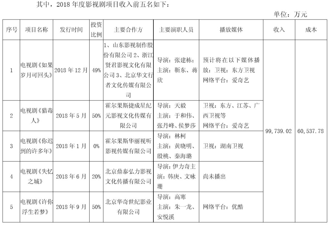 根据财报所披露名单,影视剧收入排在前五名的电影分别为《西游记女儿国》《厉害了,我的国》《欧洲攻略》《长城》《唐人街探案2》,实现收入共计3.4亿元,扣除成本获利近1.6亿元。