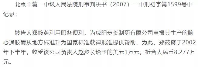 更重要的是,也正是在这一年,赵步长向国家食品药品监督管理局局长郑筱萸行贿1万美元,招牌产品脑心通胶囊成功拿到批文,从地方标准升为国家标准。