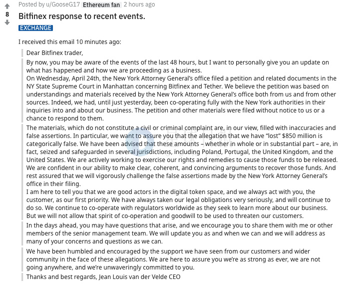 随后,Bitfinex 向用户发送邮件,再次保证其财务状况良好。Reddit 用户 GooseG17 将邮件公布,部分内容如下:“事实上,就在昨天之前,我们一直在全力配合纽约当局对我们业务的调查。……关于我们‘损失’8.5 亿美元等指控是绝对错误的。我们正在积极努力行使权利和补救措施,以解冻这些资金。我们有信心能够为收回这些资金提出明确、一致和有说服力的论据。请放心,我们将对纽约总检察长办公室在其文件中所作的虚假断言提出有力的质疑。”