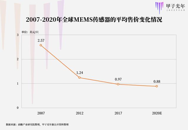 2007年-2020年全球MEMS传感器的平均售价变化情况(单位:美元/只)
