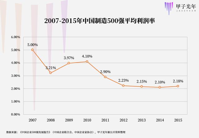 中国制造业500强的利润率已从2010年5%的高位,跌到了近年的2%左右。