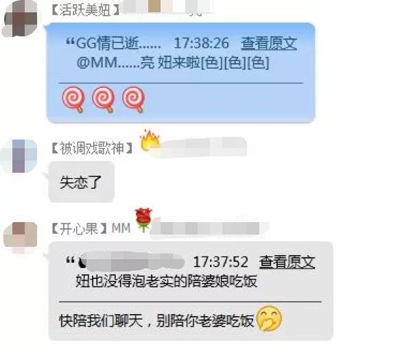 有人说“妞也没得泡,老实陪老婆吃饭”,则有人回复“快陪我们聊天,别陪你老婆吃饭。”更甚者,还会说:“你看上她老公了?我让你带绿帽子”......总之群里聊天尺度之大,并非单纯的以歌会友。
