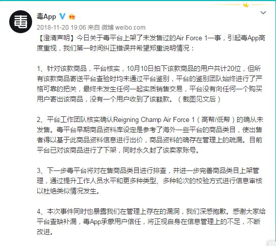 对于平台假货问题,毒App回应称作为第三方平台,毒App不涉及供应采购,他们主要提供鉴定服务,是售假的天敌,鉴定过程难免出现少量误差。从回应中可以看出,毒App官方将假货的出现归结为鉴定失误。