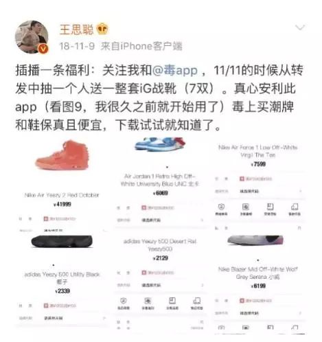 拥有4500万微博粉丝的王思聪在发布抽奖信息时,要求关注毒App。在顶级流量的帮助下,毒App一夜之间便成为苹果Appstore体育类第一名。同时有数据显示,毒APP在2018年每月GMV已经接近2亿元。