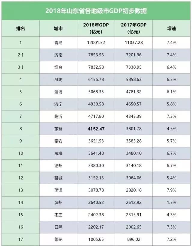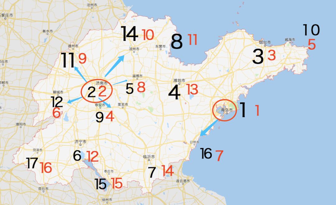 泰安上升3位,青岛下降4位,烟台下降4位,济南下降5位,聊城下降5位,潍坊下降6位,济宁下降6位,临沂下降7位,淄博下降11位,德州下降11位,日照下降14位,威海下降18位,滨州下降19位,东营下降21位,枣庄下降29位,莱芜下降38位。