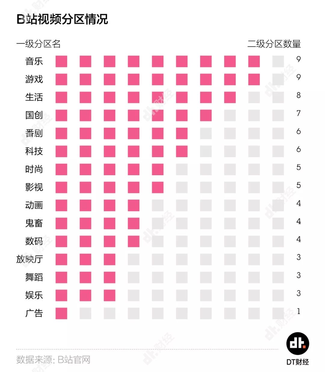 从比较独特的内容分区,大致能分辨出B站运营者的趣味导向。与优爱腾很不一样,B站的内容以原创自制(后称UGC)为主,15个分区中,有12个是UP主自制视频区。