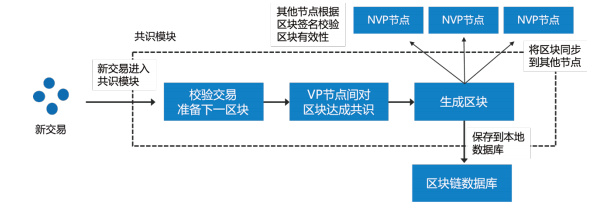 其中数据同步功能是指各个联盟成员节点之间的数据通讯接口,负责同步账本区块数据,区块状态等信息,其中参与共识的节点(VP)之间需要进行完整数据的同步,并向其他所有节点广播共识确认信息,生成新的区块。不参与共识的节点(SVP)之间仅进行最小集合数据的同步,获取该节点需要的指定部分区块信息更新情况。