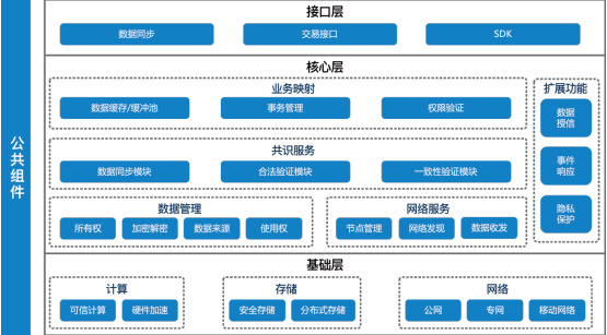 核心层顾名思义是区块链服务架构中的主要功能实现层,包含业务映射(智能合约等)、一致性服务(共识服务等)、数据管理、网络服务、扩展功能几大模块。