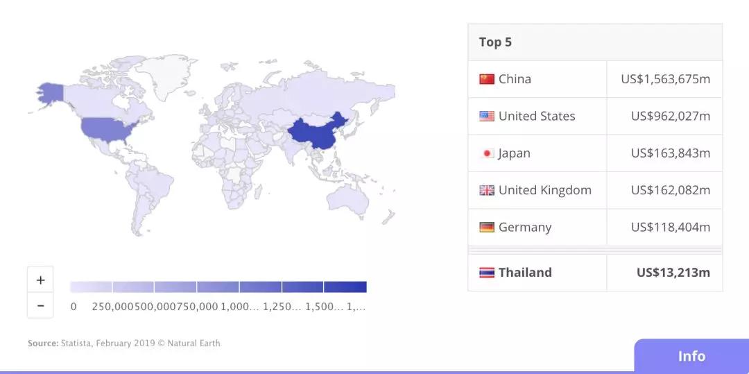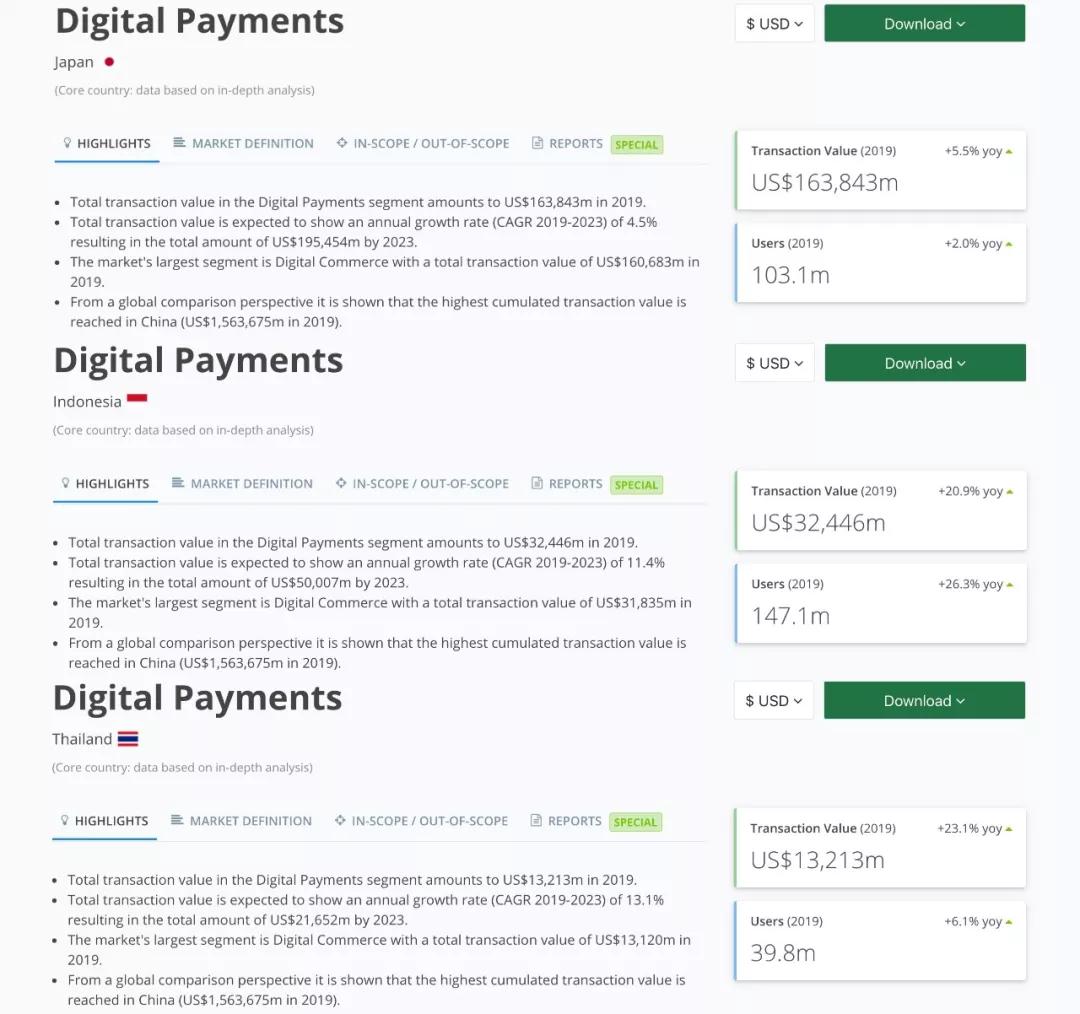 我们可以看一下市场调研机构The Statistics Portal的报告,里面有对日本、泰国以及印度尼西亚几个国家的移动支付市场规模数据。