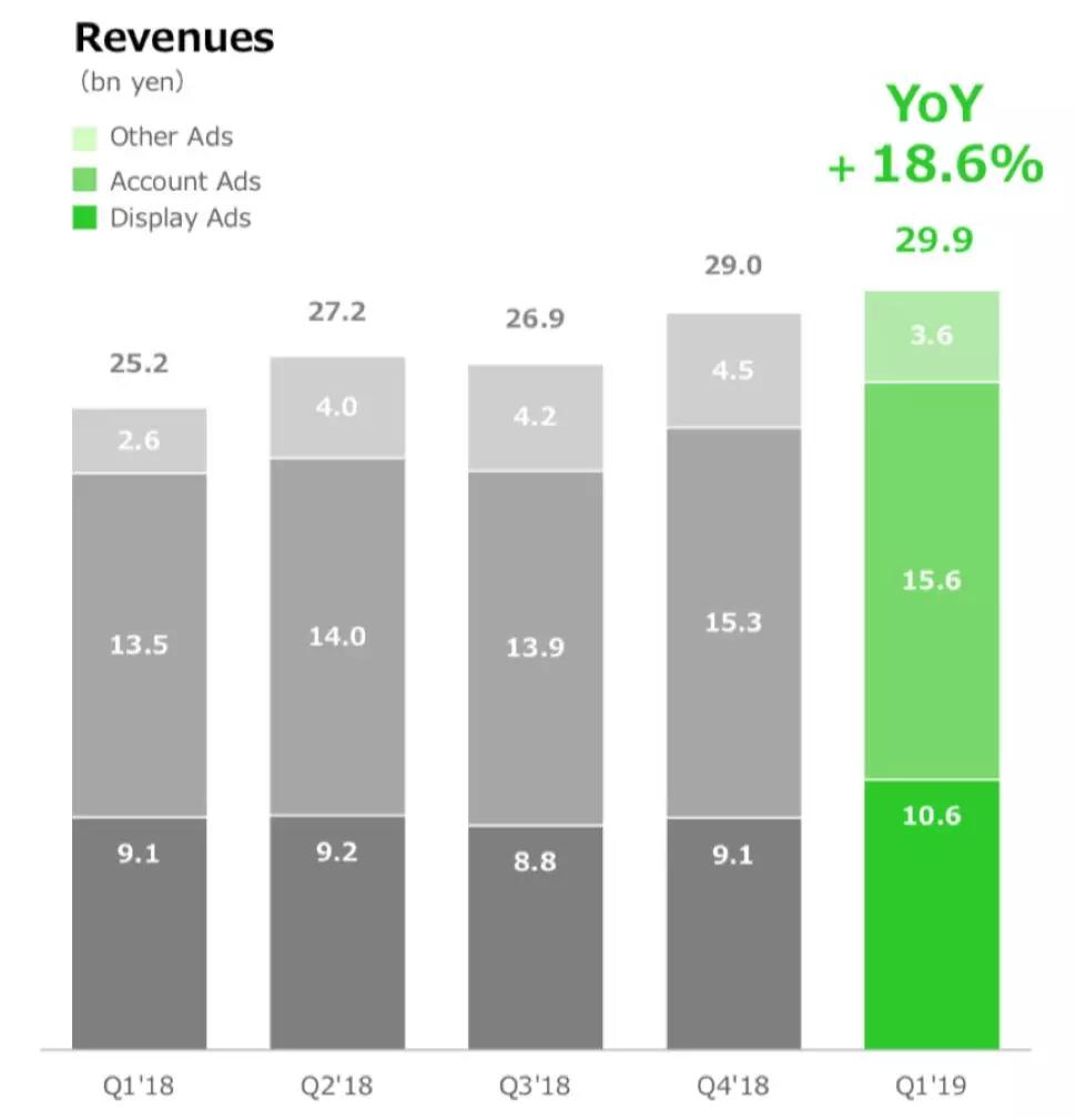 Line 2019年一季度财报显示,公司2019年一季度营收为553亿日元,同比增长13.5%。