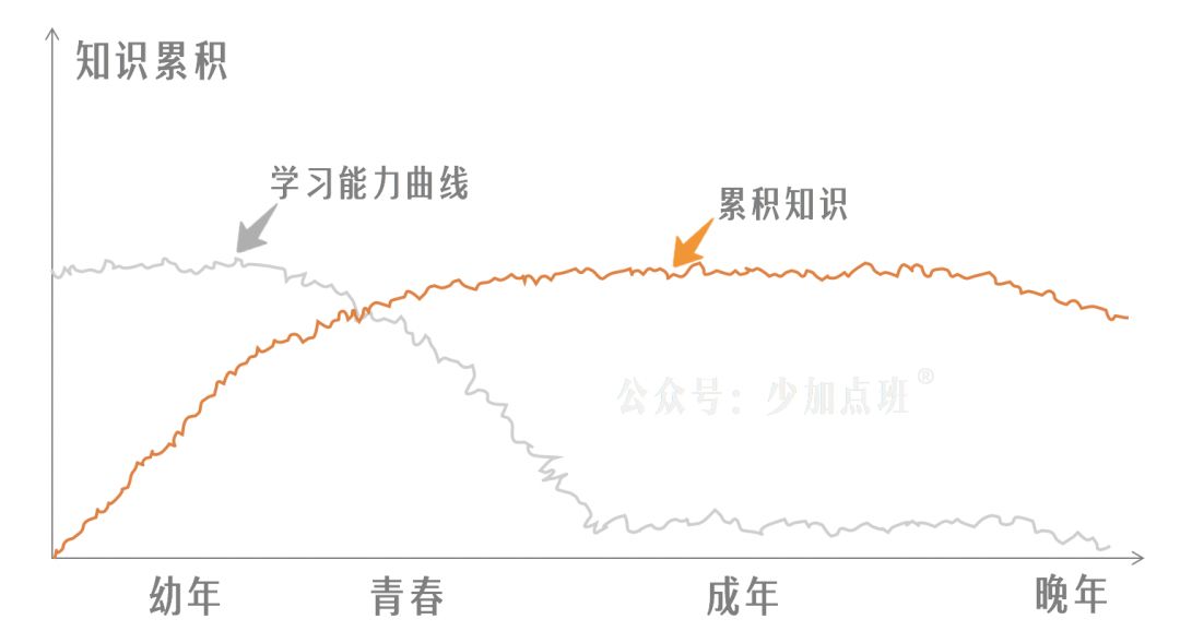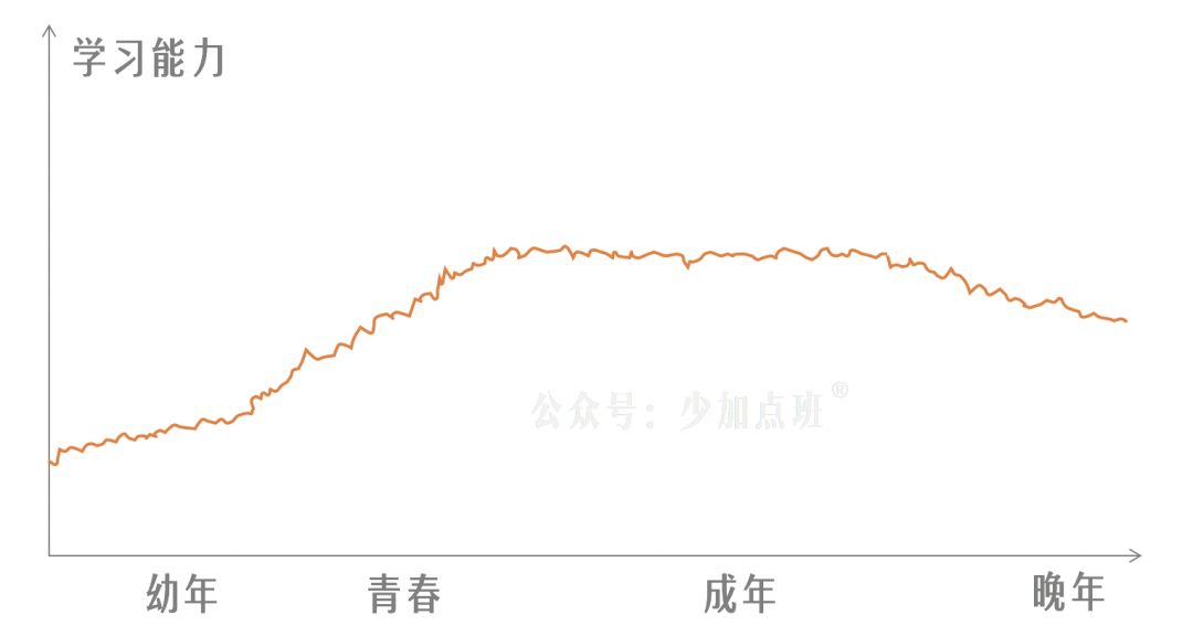 即幼年到成年,大脑一直在发育,智力跟着提升,而随着“自控力”变强,注意力也随着提升,于是学习能力整体一直在上升,直到成年期,学习能力保持平稳,最后老年了开始衰退。