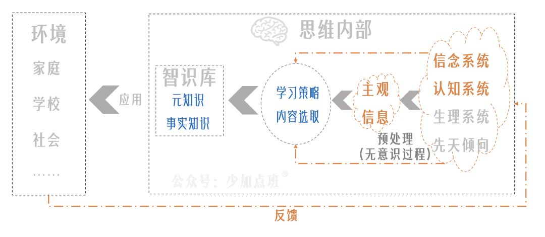 “信念及认知系统”则取决于我们将“智识库”应用于环境后的“反馈”(橙色字体),即“反馈”是否达成我们的期望。