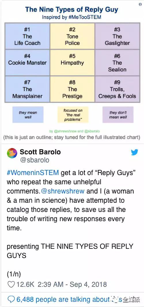 Twitter上的两位学者,@shrewshrew和Scott Barolo对这些人做过专门的研究,并根据所观察到的回复者行为将他们分成了9个子类别,例如专注蒙骗女性,降低她们对事物判断力的Gaslighter。
