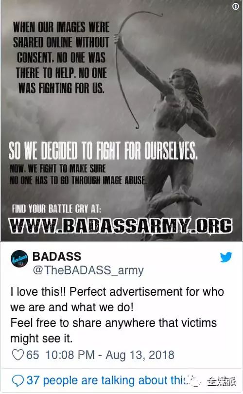 这股反抗的力量正在形成组织,BADASS即是一例。它通过游击战术来阻止亲密图片的传播,并向所有匿名的喷子发出警告。