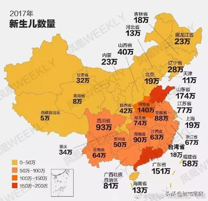 我们先看下整个2017年新生儿的数量,你会发现整个广东省的人口新增竟然高达151万,仅次于山东省的174万,比最会生的河南省还多了11万,是江苏新增人口的两倍