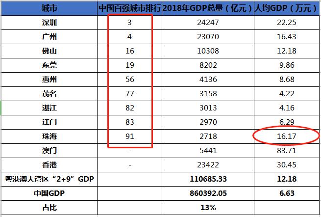 经济总规模处于第三梯次和第四梯次的澳门、珠海则跃居第一和第二梯次,珠海人均GDP逼近广州