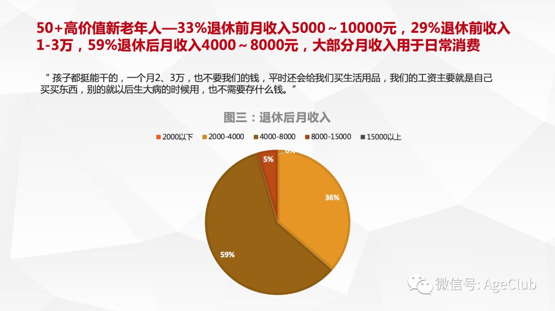 注:本文所称高价值新老年人是指具备高消费意愿和高消费能力,有两种情况需要说明,一部分老年人虽然拥有极高收入但不愿意消费;还有一部分老年人收入很低但家庭消费能力很强!