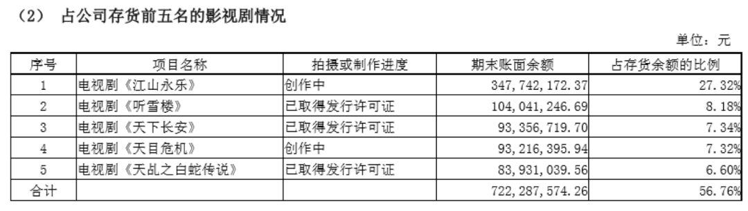 而影视剧项目的回款也影响到公司的存货上升。比如,光线传媒同期存货同比上涨4.58%至15.47亿元,其中排在前五名的存货《疯狂的外星人》《雪暴》《新世界》《听雪楼》《三体》合计账面余额为8.75亿元,占年末余额比例为54.33%。