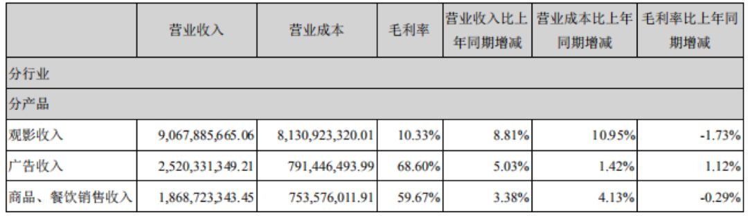 但观影收入毛利率同比下降1.73%。这是因为,全国银幕增速仍快于整体票房增速,影院同质化竞争激烈,市场竞争进一步加剧,经营效率较低的影城关停数量较往年有所增加,万达在这场院线战役中首当其冲。