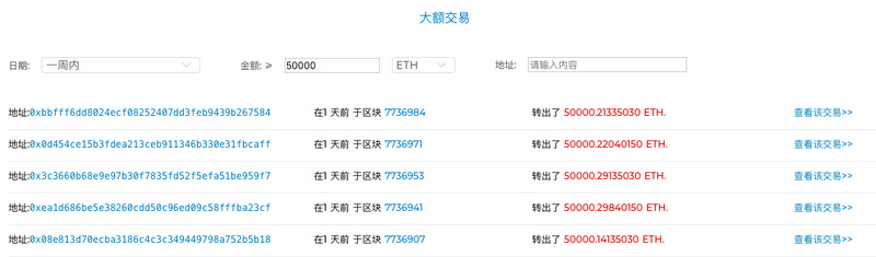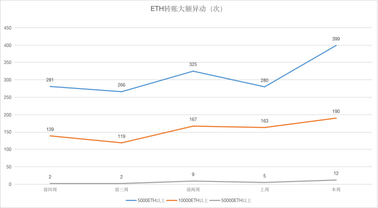 另外,本周转账“50000个ETH以上”次数为12次,环比上涨 140%;值得注意的是,其中有10笔交易,转账数额均为5万ETH,这些资金最终被进行分拆。