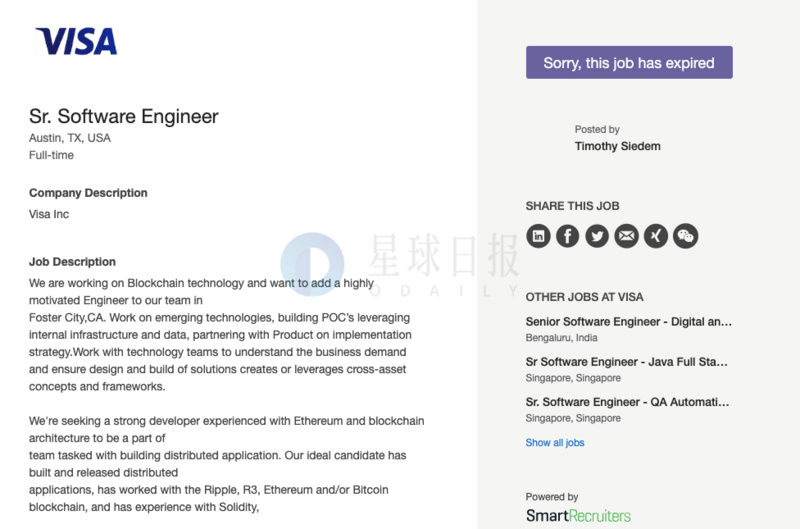 6.VISA发布区块链相关开发者岗位,要求在以太坊架构方面具有丰富经验