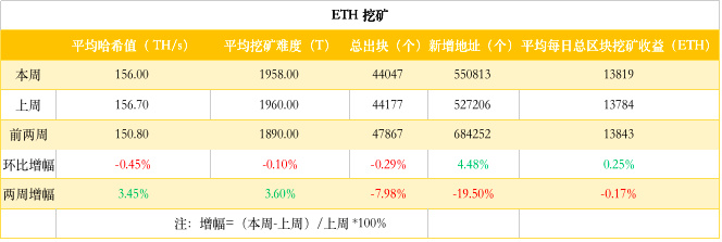 etherchain.org数据显示,目前ETH出块时间约为 13.4 秒;全网平均算力( 156 TH/s)以及平均挖矿难度(1958T)相比上周没有多大的变化。