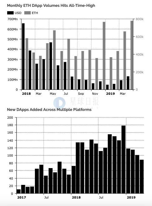 据Diar最新报告,4月份以太坊DApp交易量创今年以来新高;与此同时,在多个平台新部署的DApp一直在逐步下降,创近15个月新低。[相关文章]