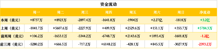 资金方面,本周资金波动较大。其中周六净流入资金较高,超过 2.2 亿美元;周三净流出资金最多,超过 2800 万美元。