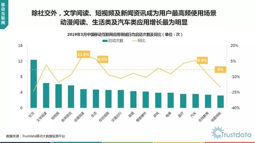 据Trustdata大数据近日发布的《2019年1季度中国移动互联网行业发展分析报告》显示,3月份,虽然文字阅读、短视频以及新闻资讯是除社交外的最高频使用场景,但动漫阅读紧随其后,且排在综合视频、出行、音频的前面。另外,动漫阅读的日均启动次数同比增速超过文字阅读,在互联网应用领域最高。