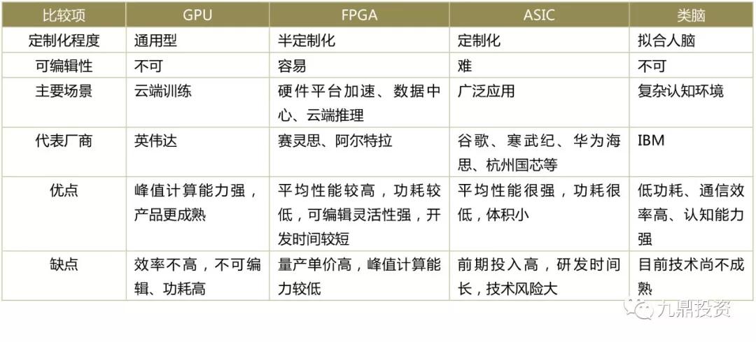 综合来看,未来可能呈现如下产业格局:GPU应用于高端复杂算法、高性能计算和数据中心;ASIC在云端训练、推理及智能终端广泛应用;FPGA 应用于变化较快的行业应用和虚拟化云平台。