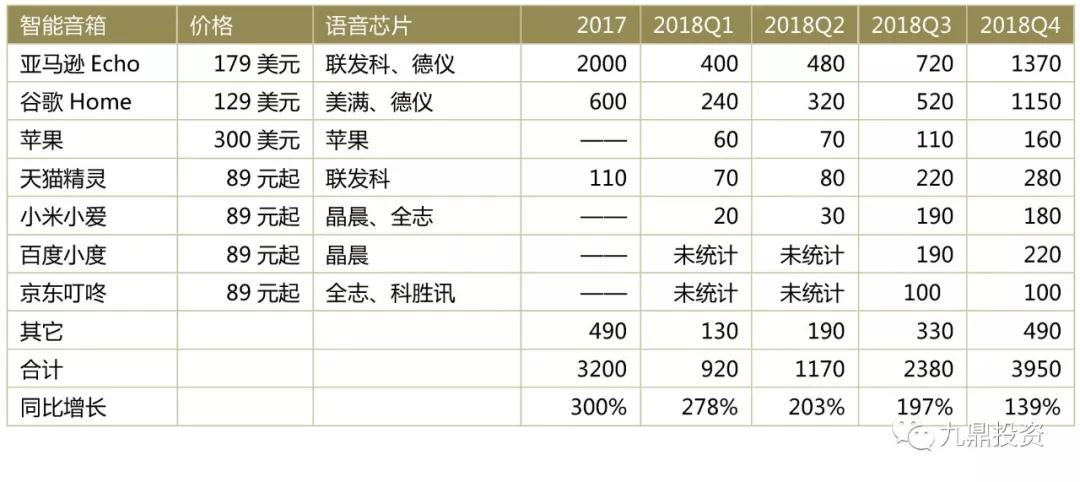 表2:主要智能语音音箱出货量及采用芯片方案统计(单位:万台)