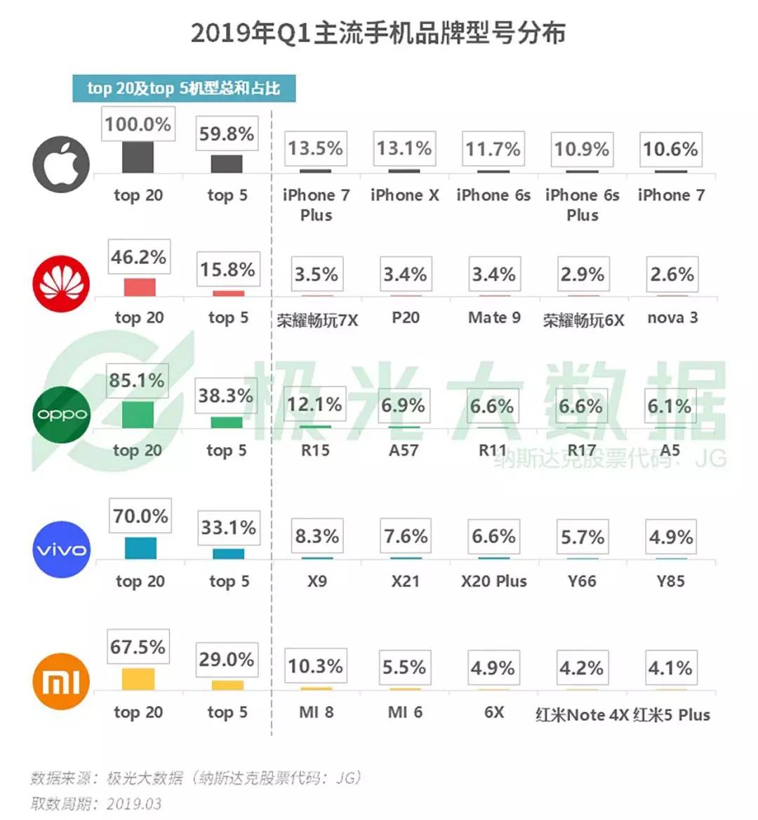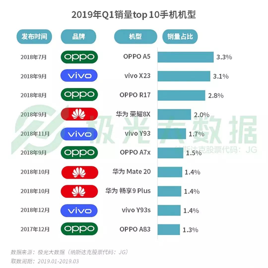 极光大数据显示,2019年7月底发布的OPPO A5成为Q1销量占比最高的机型,上榜机型中OPPO机型占4席