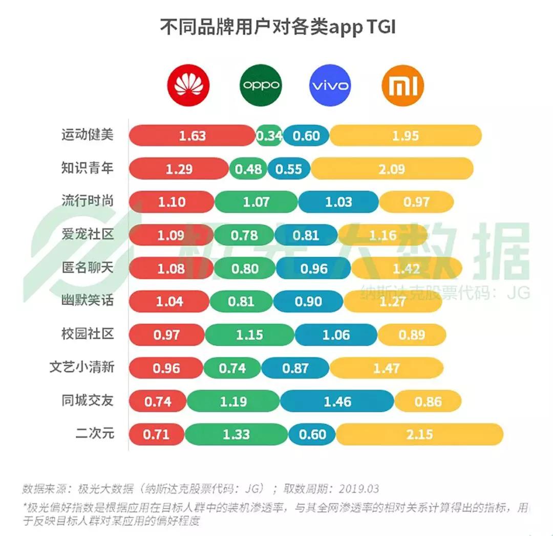 极光大数据显示,华为、vivo用户最偏爱的app类型分别是运动健美和同城交友,OPPO、小米用户均偏好二次元类app