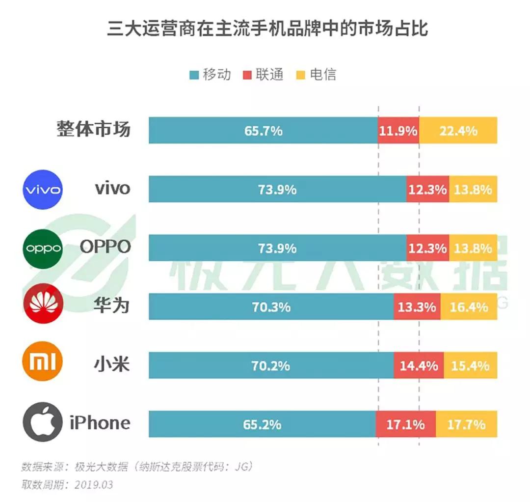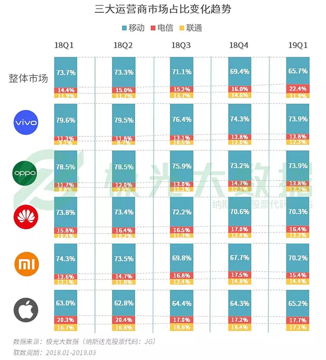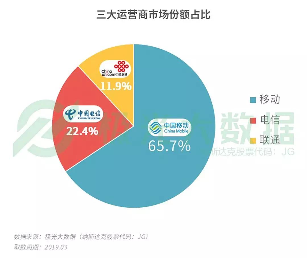 根据极光大数据显示,移动、电信和联通的市场占比分别为65.7%、22.4%和11.9%,移动市场份额占比较上季度有所下降
