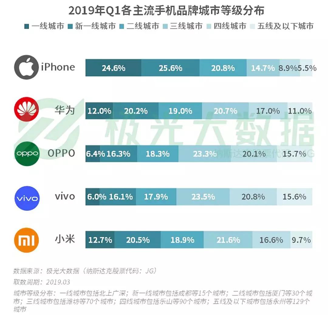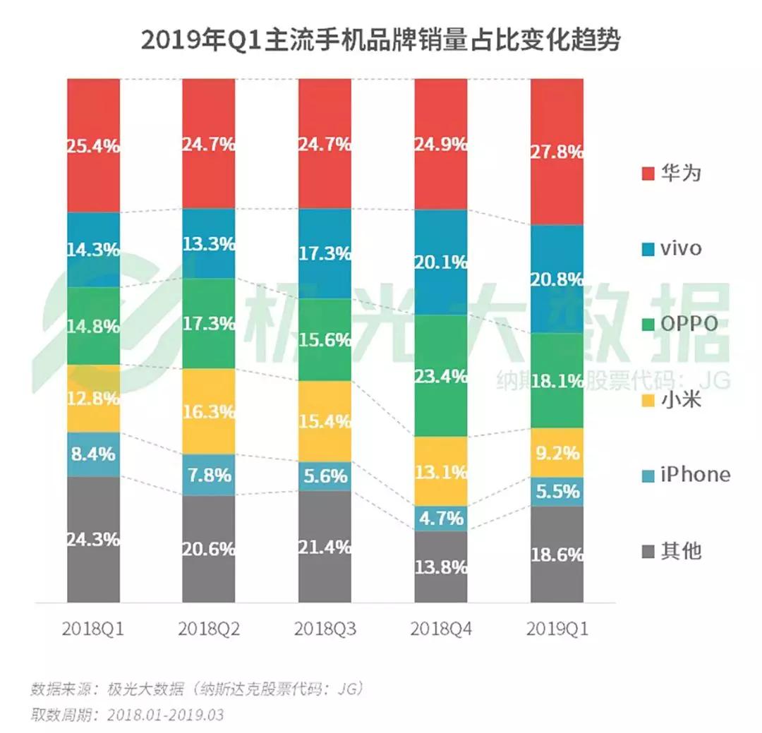 根据极光大数据统计,2019年Q1国内手机品牌销量占比top 5分别是华为、vivo、OPPO、小米和iPhone,其中华为以27.8%销量占比居于首位