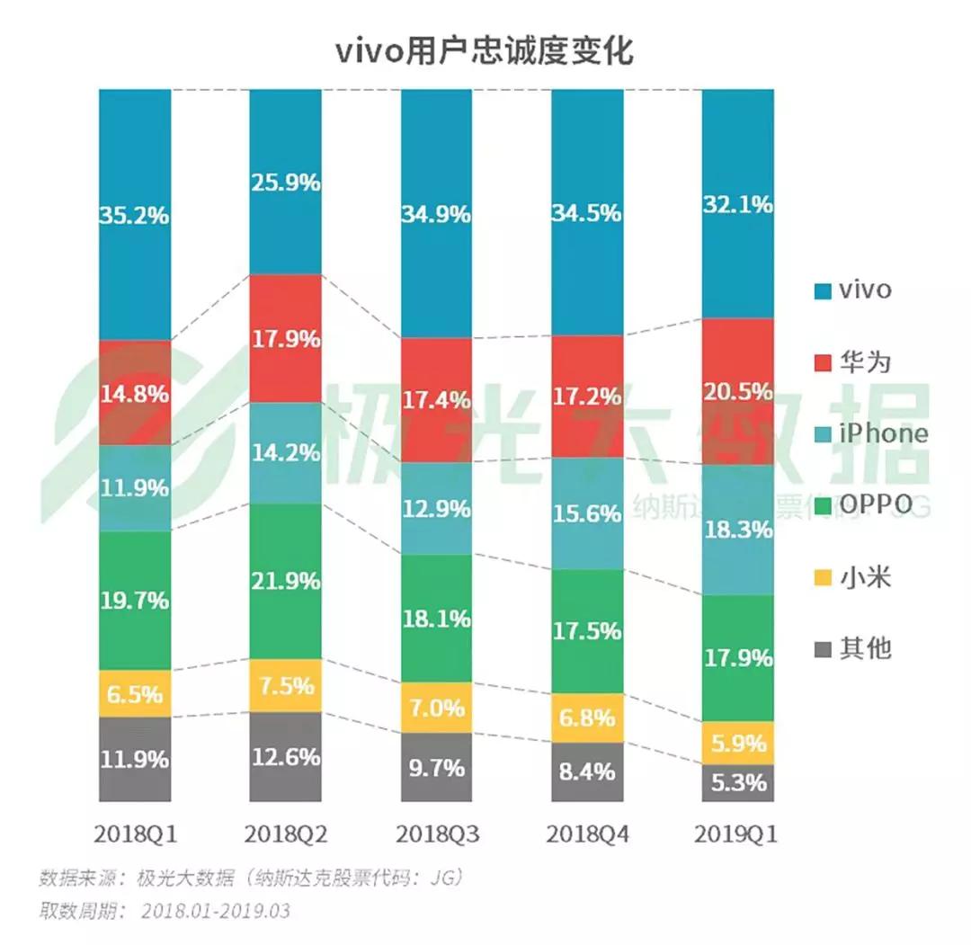 极光大数据显示,2019年Q1 vivo用户的忠诚度为32.1%,另外有20.5%的用户转向使用华为;本季度iPhone对vivo换机用户的吸引力仍在提升,达18.3%