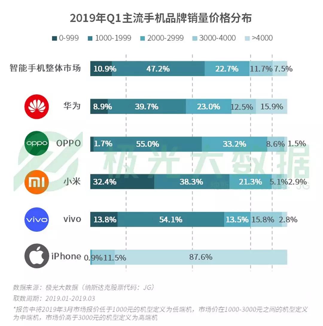 极光大数据显示,华为低端机型销量占比有明显增长;小米定价4000元以上的新机型销量占比达2.9%