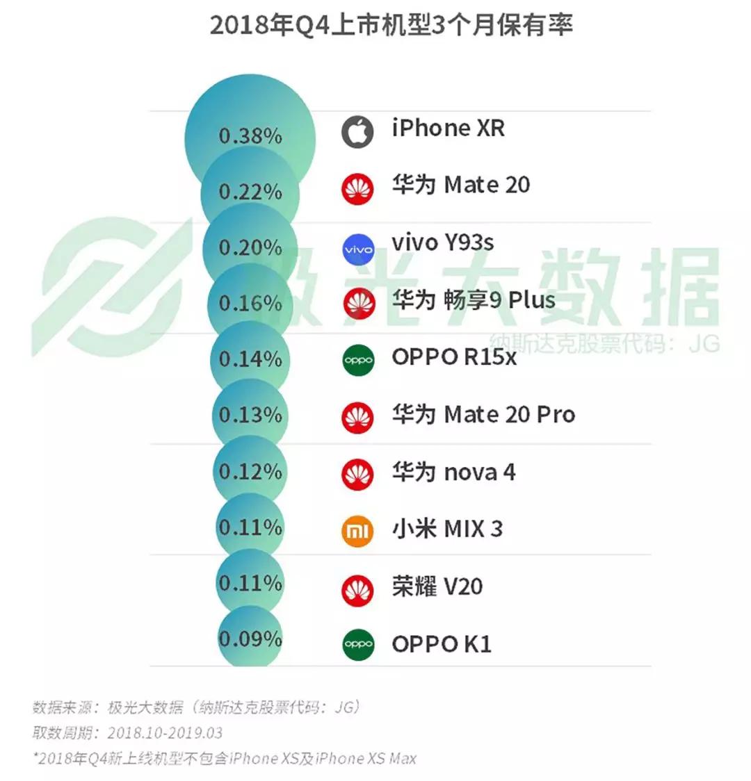 新机型中iPhone XR上市3个月的保有率最高,为0.38%