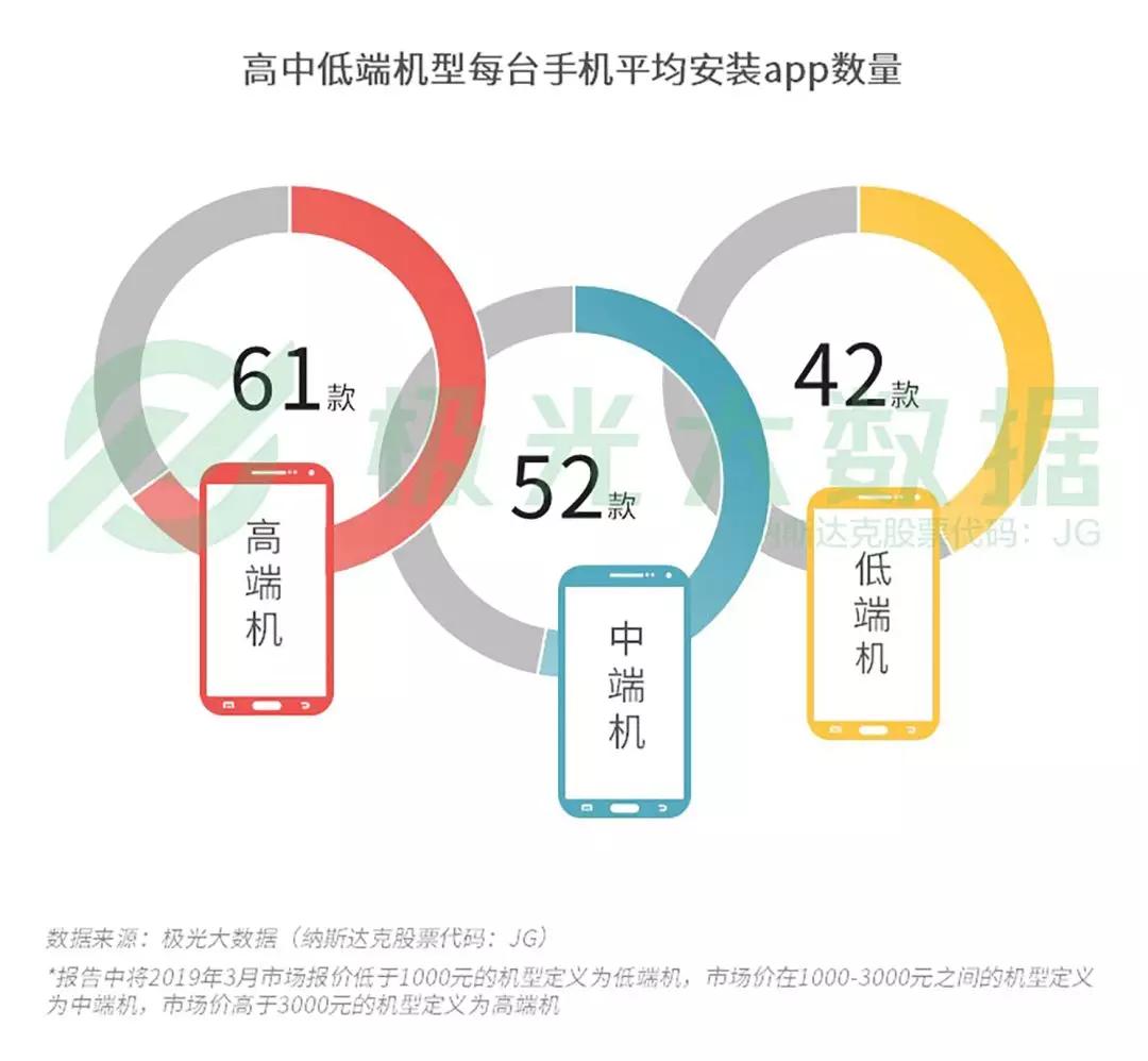 极光大数据显示,平均每台高中低端手机中安装的app分别为61款、52款和42款